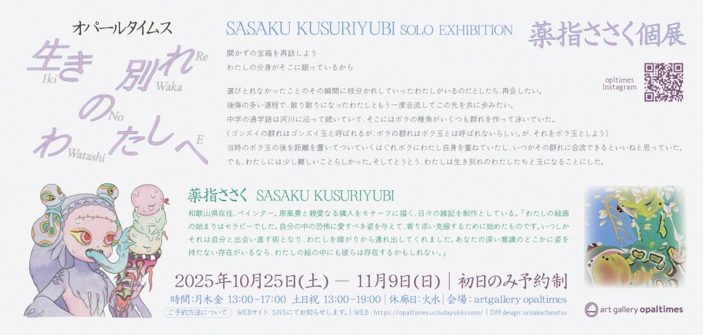 ———————————————————— 薬指ささく個展「生き別れのわたしへ」 2025年10/25(土)〜11/9(日)初日のみ予約制 (10/9(木)21:00からオンラインストアにて初日ご予約スタート)https://opaltimes.stores.jp/ 時間: 月木金 13時-17時 土日祝 13時-19時 火水休廊